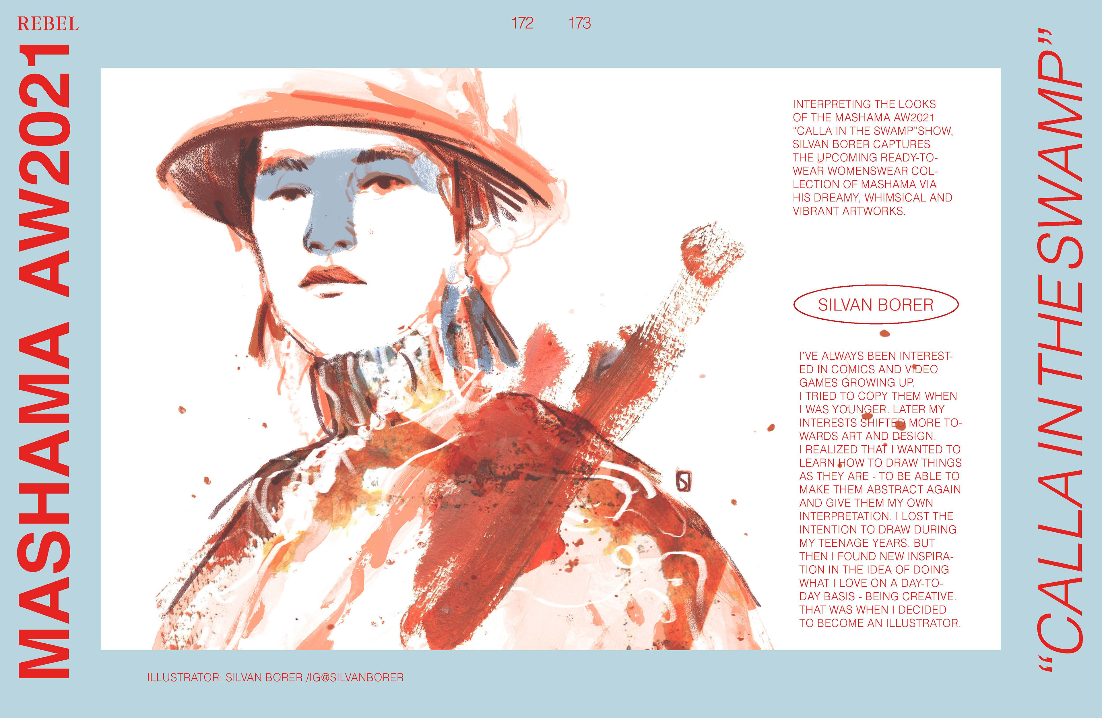 Interpreting the looks of the MASHAMA AW2021 “Calla in The Swamp”show, Silvan Borer captures the upcoming ready-to-wear womenswear collection of Mashama via his dreamy, whimsical and vibrant artworks.